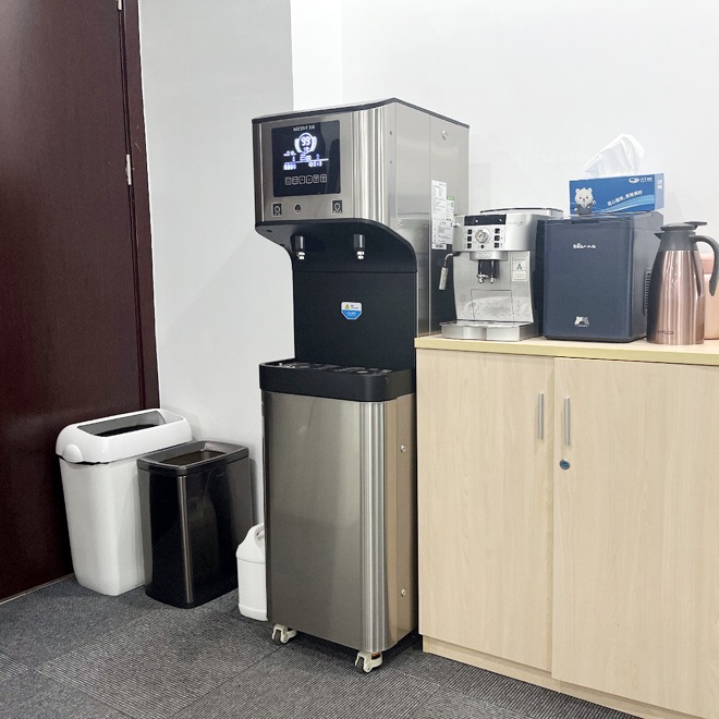 美辰商用直飲機ME205B采用先進的RO反滲透過濾技術,能有效的去除水中泥沙、雜質、異味等有害物質,還有冷熱溫控功能,滿足員工泡咖啡與0泡果茶的需求。